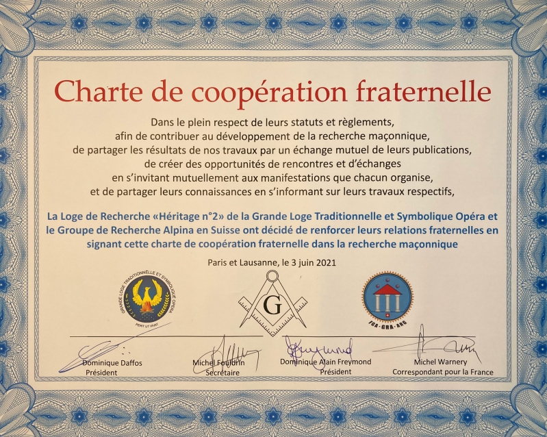 - Am 3. Juni 2021 haben die Forschungsgruppe Alpina und die Forschungsloge "Héritage Nr 2" der Grande Loge Traditionnelle et Symbolique Opéra (GLTSO), mit Sitz in Levallois-Perret, Frankreich, haben eine Charta der brüderlichen Zusammenarbeit unterzeichnet, um den Austausch von freimaurerischen Forschung und Publikationen zu verstärken.
