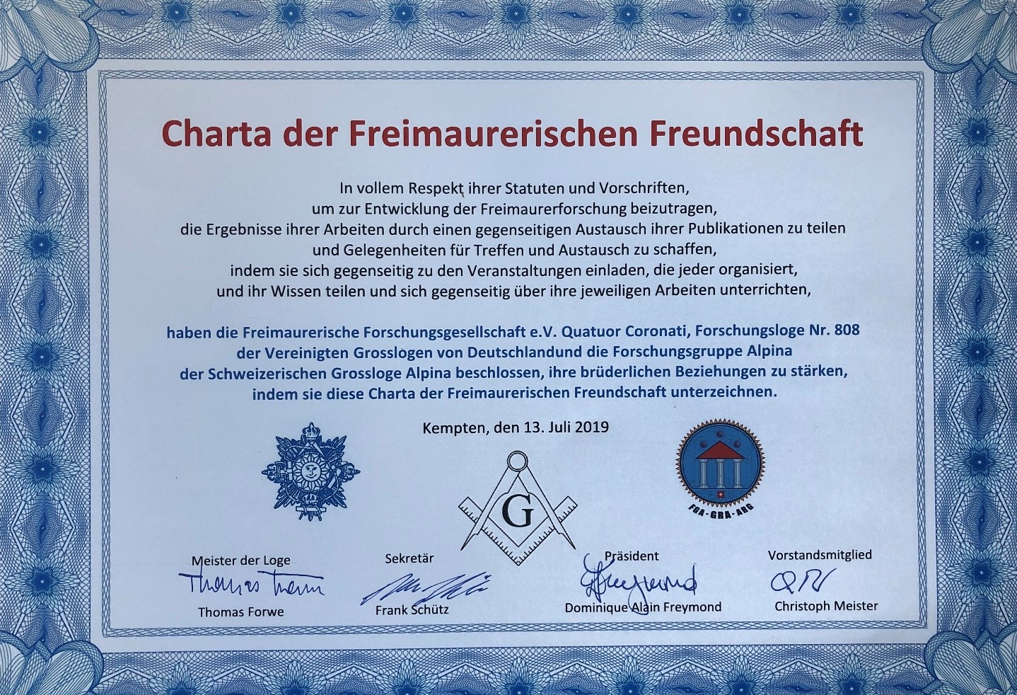 - Juli 2019: Freundschaftscharta mit der Forschungsloge Quator Coronati Bayreuth